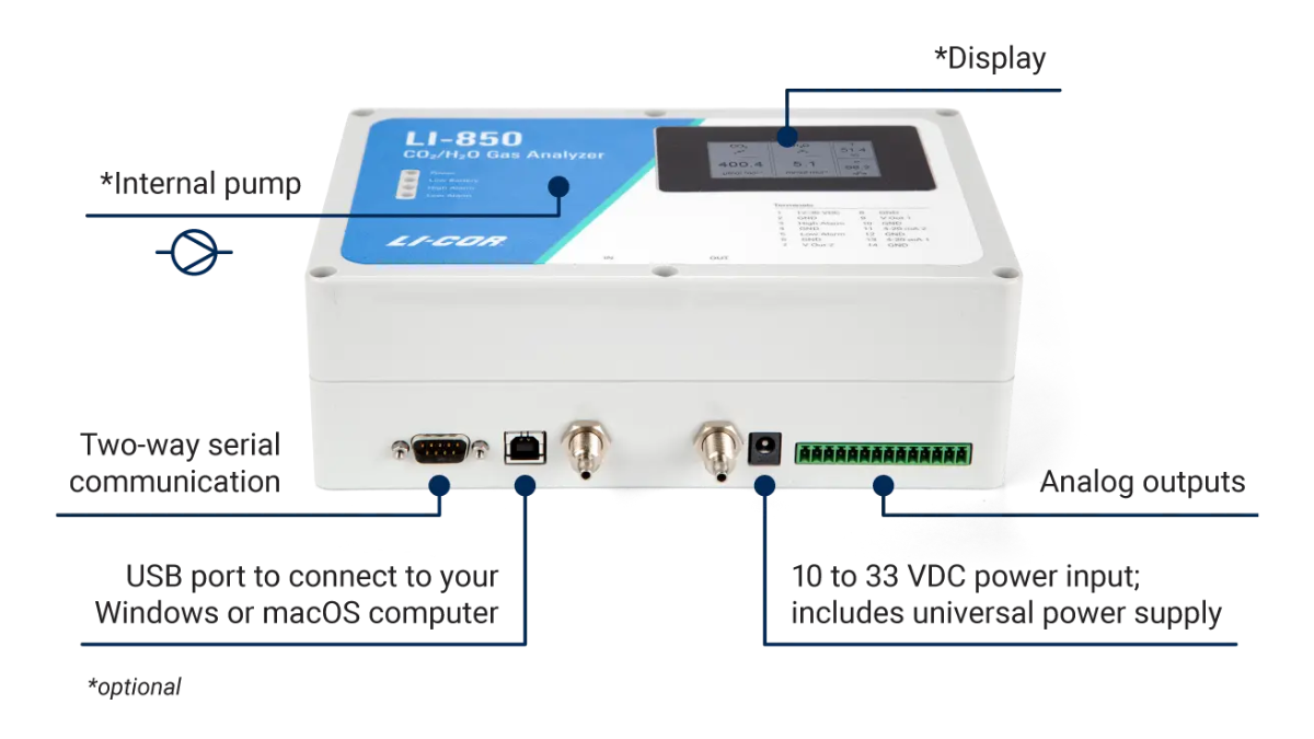 The LI-830 and LI-850 are available with an optional pump for an out-of-the box flow solution and an optional display to view measurements in real time without a computer or datalogger. All LI-830 and LI-850 gas analyzers feature configurable alarms to trigger a switch when a CO2 or H2O threshold is crossed.